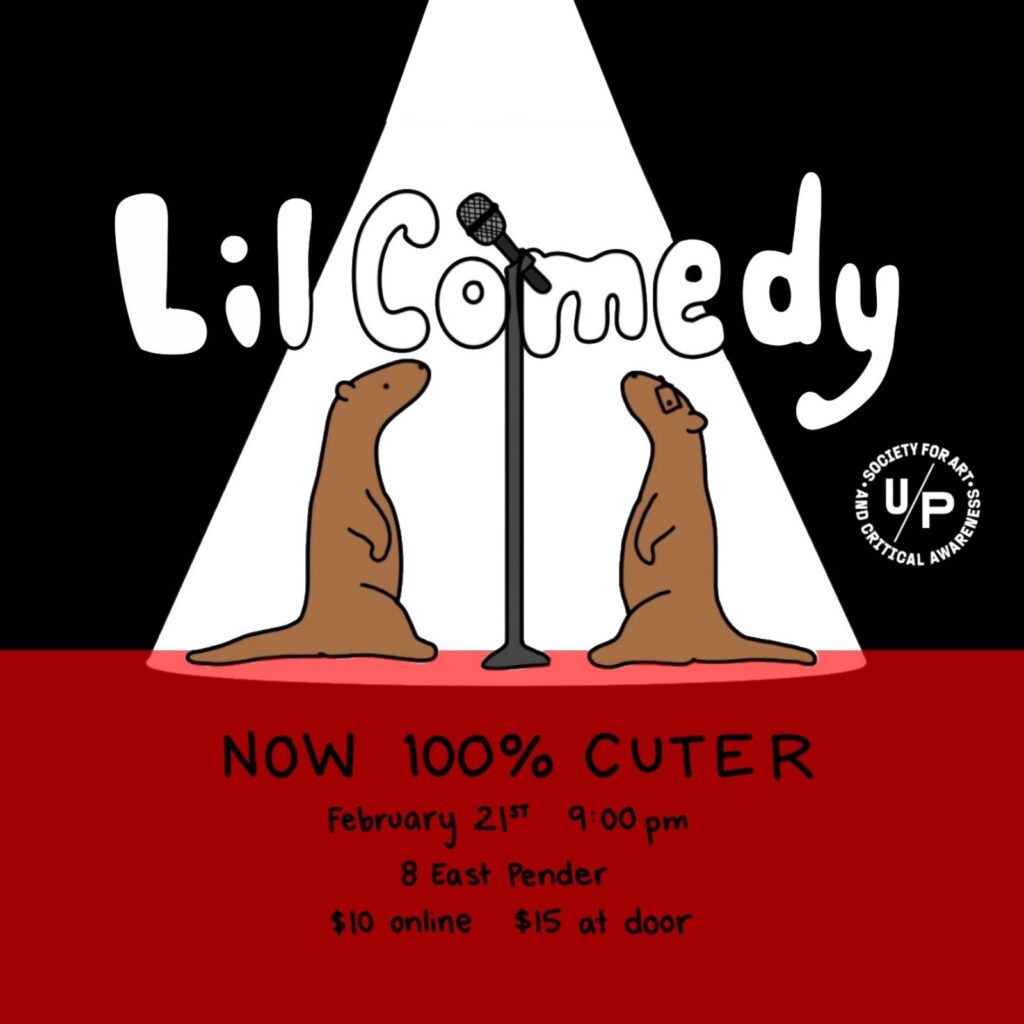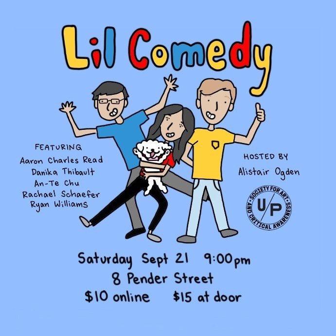 Lil Comedy is a monthly show for local emerging and visiting comedians, founded and hosted by An Te Chu, Alistair Ogden and Andrea Jin, and later An Te and Alistair exclusively. Every event features original artwork by Alyssa Hirose (Hialyssa Comics). Lil Comedy ran from September 2019-February 2020 at 8EAST. The March 2020 show was indefinitely postponed due to the pandemic, but Lil Comedy will resume at a new venue in the future.